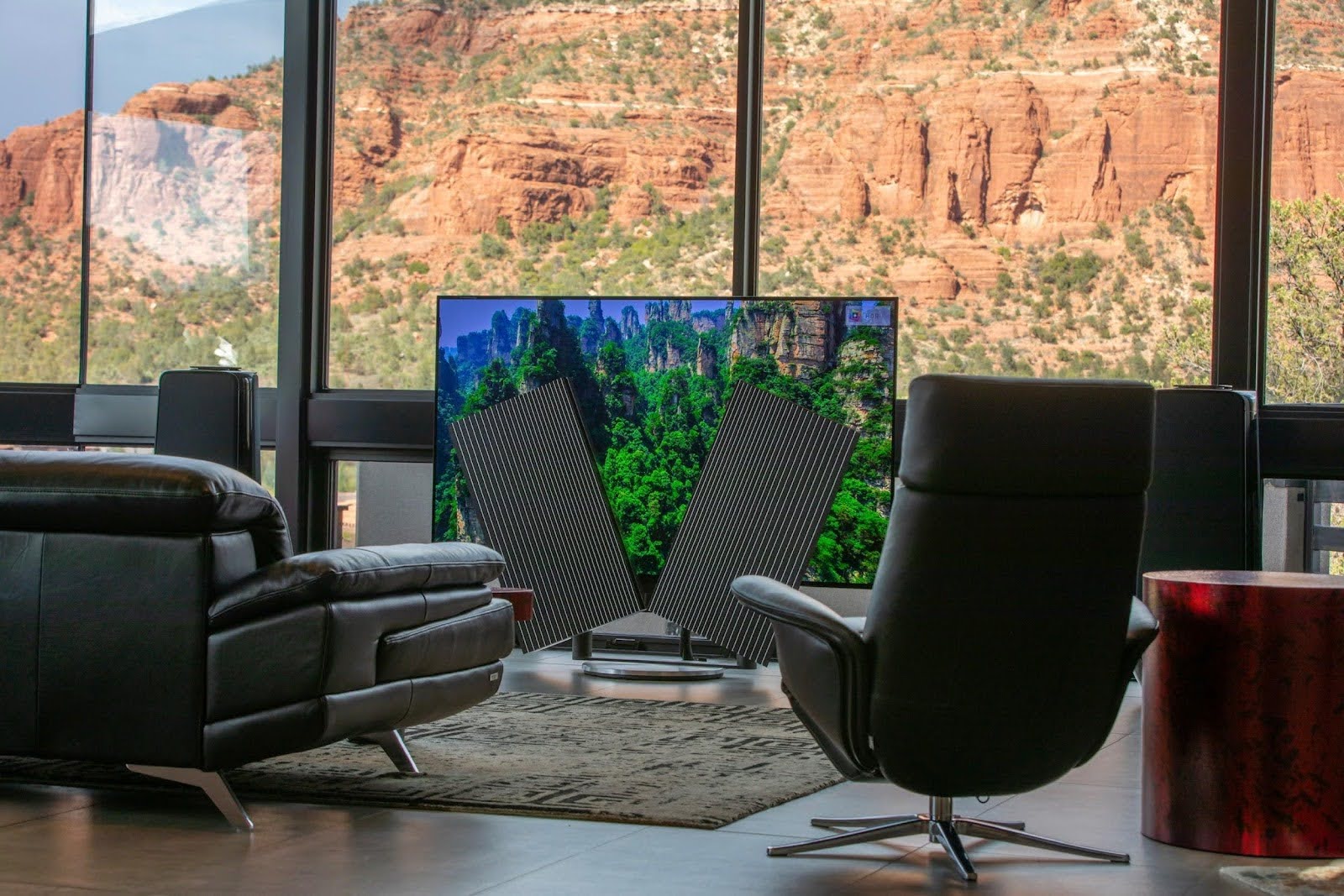 Today, his Sedona home is a stunning showcase of modern Bang & Olufsen performance. The residence features one of the first blacked-out black oak Beovision Harmony televisions paired with BeoLab 50s, creating a powerful yet elegant focal point that complements the dramatic desert landscape. BeoLab 28s deliver refined sound in the bedroom, while smaller B&O speakers bring seamless audio to every room, including the garage.